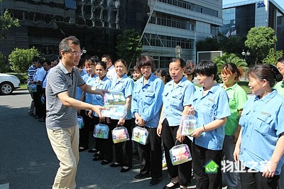 7月31日上午,在骄阳似火、烈日炎炎的高温日,闸北区总工会副主席王家奇、市北高新集团及公司领导来到总部经济园,向奋战在高温酷暑下的一线保安、保洁工带来工会组织的关爱,送上清凉慰问品。
