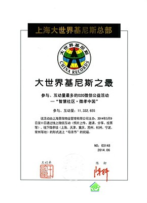 5月17日上午,大世界基尼斯之最颁证仪式在招商局景瑞地产会议室举行。景瑞物业主办的智慧社区微孝中国母亲节活动,以超千万人次的020微信公益活动参与、互动量,创造了大世界基尼斯新的奇迹和新的记录。市物业协会会长朱志荣、虹口区房管局副局长孔敏、大世界基尼斯CEO王以卓、理事査民华,云传媒商务总监梅丽华、戴春丽见证了激动人心的颁证现场。