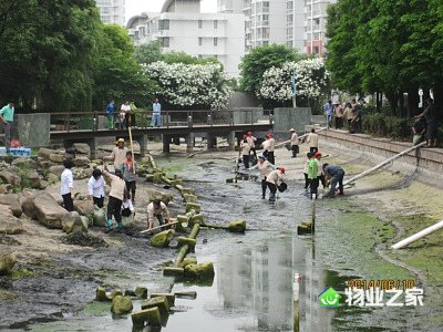 管理处此次清理的河道是小区入驻8年以来首次大规模清理,这条长150米,深1.5米的河道如要注满水,需要千余吨水,这对运作经费紧张的小区来说显然是不可能,所以河道是靠天然雨水补水,管理处日常能做的清理工作也只有打捞落叶,清理河道边上的青苔,这些办法根本不能解决淤泥日积月累增多产生的恶臭现象。于是,彻底清理小区河道,让居民安度清新夏季的设想开始酝酿。