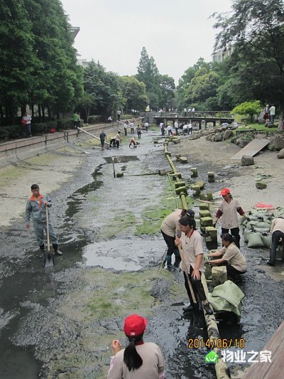 好的设想,没有周密的事前策划显然是不行的。为了顺利完成清理河道任务,管理处买了30多把铁锹,3500只蛇皮袋。为了调齐人员,客服人员全部参加劳动,秩序维护部刚上完夜班的队员也加入战斗,小区外包保洁公司也无偿派员加入。在这60多人的义务劳动队伍中,60%是女同志,她们没有叫苦也没有叫累,而是积极想办法,用排水管减缓阻力,巧妙搬运沉重的泥袋。对于如何处理这些污泥,管理处事先征询了公司保洁绿化条线专业人士的意见,将晒干的污泥用作小区绿化的基肥。于是,他们在河道就近的绿化带找了块空地,挖坑存放清理出来的污泥。接下来,管理处会逐步落实已经制定的清理小区所有景观河道计划,不日,小区居民就可以在干净的河道边纳凉散步啦。