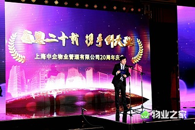 董事长朱建华代表中企公司致感恩词:饮水思源,喝水不忘挖井人;中企物业走过的20年,接受的每一份委托,取得的每一点成绩,都凝聚着业主方和各级领导给予公司的极大信任和郑重托付;继往开来,前进还需引路人!感恩过往的20年,因为有你们的信任、理解和帮助。展望今后的20年,真诚地期盼继续得到你们的关爱、支持和信赖!让我们携手再创中企物业20年的新辉煌。
