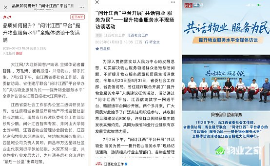 为提升物业服务质量和居民满意度,江西省委社会工作部、省委信访局、省住建厅联合开展了“提升物业服务水平”人民建议征集活动,并于7月2日举办“共话物业 服务为民”全媒体访谈活动。大江网门户网站及客户端、大江网视频号、“江西社会工作”微信公众号等媒体、平台纷纷宣传报道。