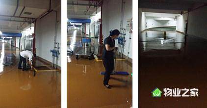 得知情况后,正准备换衣服下班的几个设施师傅及环境员工纷纷找来吸水机、拖把、警示牌等工具赶赴现场。大家积极行动起来,两台吸水机轰轰的运作,原本安静的负二楼顿时格外热闹。