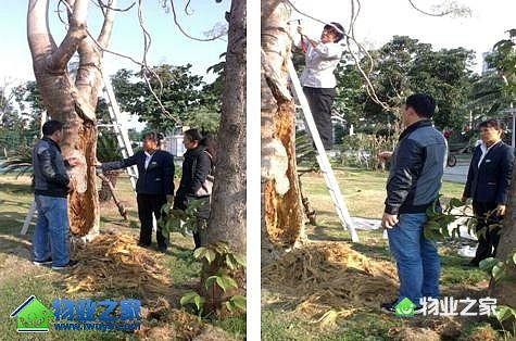 在台风“威马逊”的肆虐下,海甸小区的大橡树被台风刮倒。开元物业海南分公司三个小区服务处海甸小区的工作人员一起将被风刮倒的大橡树扶起,并进行了包膜养护,然而经过了几个月的养护效果却不是很理想。开元物业海南分公司区域总监刘总在了解情况后,对此十分重视,并做出了重要指示:务必要尽力将这棵大橡树救活。三个小区服务处李经理马上进行拯救大橡树工作安排。海甸小区物业主管田静和环境运营专员陈慧琼在现场对大橡树进行了观察,并对大橡树的具体情况进行了解。由于大橡树的情况比较特别,是受到自然灾害的破坏才出现的病害。于是运营专员陈慧琼联系了园林专家方站长,将大橡树的病害情况反应给方站长,并邀请方站长到海甸小区对大橡树进行现场观察和治疗。