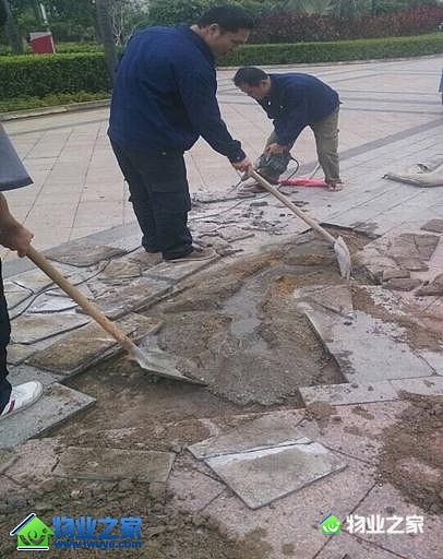 下班后,维修领班组织维修班组全部人员进行路面石材维修,大家先提前准备水泥、沙子、拉好临时电源,挖开凸起的石砖,并用电锥把硬的水泥块敲平,用切割机切好石砖进行修补,由于面积较大,设施部人员先用测量绳固定好方向和距离,在细心的把一块块大理石地砖铺平。等设施人员把全部地砖铺好,已是满街灯火辉煌。