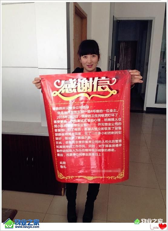 信中表示,开元物业入驻世茂东都翡翠谷第二天,由于业主家卫生间吸顶灯坏了需要更换,业主抱着试试看的态度拨通了开元物业客服电话,客服人员了解情况后第一时间安排设备部薛师傅前去查看维修,吸顶灯维修起来很繁琐,薛师傅经过一个多小时的耐心安装,终于解决了业主的燃眉之急,特送来此信,以示感谢。