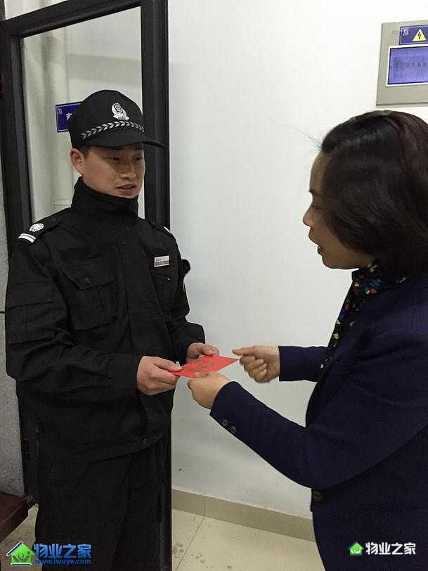 “相邀守岁阿咸家,蜡炬传红映碧纱”。除夕守岁,一家人开怀畅饮,团圆取乐,正是共祝新年到来的美好时刻,但萧安物业服务处的安保人员、设施人员却坚守在岗位,无怨无悔。2月18日晚8点,时不时看见远处腾空洒落的烟花和热闹的鞭炮声,此起彼伏,窗外是五颜六色的彩灯营造出节日的气氛,各家各户都在吃年夜饭、观看一年一度的春节联欢会,我们代表萧安物业服务处向除夕夜坚守在一线岗位的员工送去慰问品和对他们的感谢及新年的祝福。我们首先来到南门岗,把装有面包、糖果、蜜饯和饮料的食品及红包递到在岗人员的手中,真诚的祝福同时送上“宝印,辛苦了,辛苦了,感谢您的付出,祝您新年快乐,羊年吉祥,2015我们继续”。
