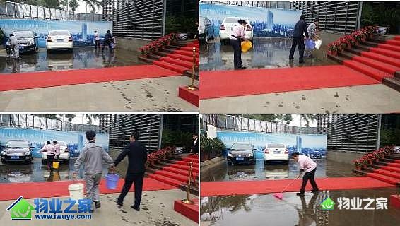 分为两个打扫小组,第一组负责外围卫生,负责清洗地面、地毯。另一个小组负责楼栋内的卫生死角清洁。各小组人员开始分工合作,有的负责提水,有的负责刷地板,有的负责冲洗地毯。另一个小组成员也不甘落后,打水、擦桌、擦墙、拖地同时进行开来。