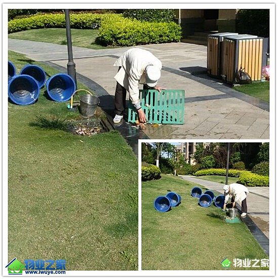 现场工作人员利用水桶、刷子等工具进行仔细刷洗,并晾干,他们不惧脏臭,干的热火朝天,在清理完果皮箱后,又顺手把排水沟网拆下清洗,经过一下午的努力,果皮箱恢复整洁卫生,获得业主称赞。