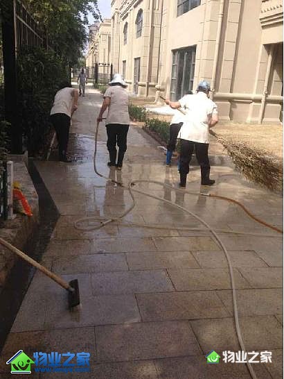 现场只见保洁人员分工合作,一人拿着高压水枪,另一个人协助搬运水管,其他人员紧跟其后认真仔细的刷洗,大家顶着烈日有说有笑干的热火朝天,经过2个小时的共同努力,别墅门外主干道恢复干净整洁,房产领导带领客户参观小区也不禁为这些辛勤劳作的开元人竖起了大拇指。
