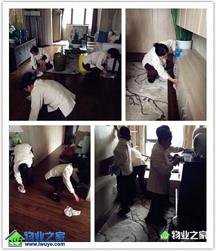 木质家具及地板因长期使用容易摩擦氧化失去光泽,需定期保养打蜡,才能有效的阻隔空气防止氧化,现场工作人员分区合作,对样板房的地板、墙面、装饰及壁橱进行全面仔细的擦拭上蜡,他们步骤明确,先喷洒上液态腊,然后用抹布进行擦拭,可以有效的去除地面残留污渍使地面更加干净明亮。经过近2个小时的努力,样板间内木质地板家具焕然一新。