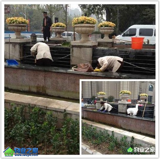 如今不少楼盘都十分注意小区环境的营造,“水”是楼盘景观中最被看重的元素之一。故它的干净卫生十分重要,保洁人员刚上班就集中在此刷洗起来。别看这活简单,由于水景池面积较大打扫起来很费劲,只见他们分工明确,先用水把水池底部进行冲洗,并用拖把清理干净。大家顾不上被水洒湿的鞋袜,埋头奋力刷洗,最终使水景池焕然一新。