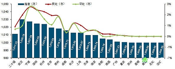 2014年12月,二十大城市物业服务价格综合指数为1011.33,较去年同期上涨0.91%,较2014年6月上涨0.66%。二十大城市的物业服务价格指数与去年同期相比无一下跌,昆明、青岛等4个城市持平,16个城市上涨,其中宁波、深圳、杭州的指数涨幅最大,均超过2%,分别为2.73%、2.46%和2.29%;武汉、北京等5个城市涨幅介于1%-2%之间;南京、天津等6个城市涨幅介于0.1%-0.6%之间;重庆、苏州涨幅较小,仅为0.07%和0.01%。