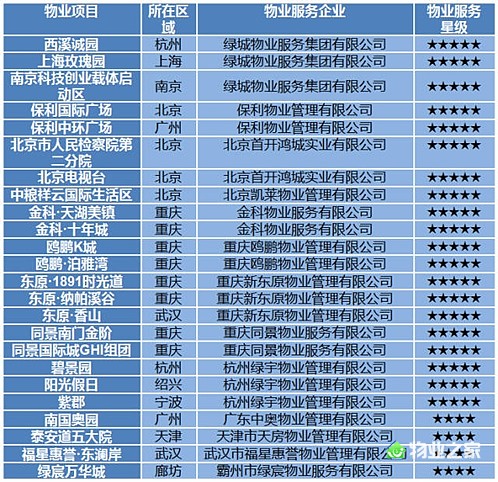 中国指数研究院对本次物业星级评价中表现突出的星级物业服务项目进行深入分析,星级物业服务项目在软、硬件方面均有突出表现:绿城服务以“为员工创造平台,为业主创造价值,为城市创造美丽,为社会创造和谐”为企业使命,致力于打造成为“中国最具价值智慧园区运营商”,为物业服务行业的健康快速发展做出新的贡献,旗下管理项目西溪诚园、上海玫瑰园、南京科技创业载体启动区荣获五星级;保利物业秉承保利地产“和”文化理念,全力打造“中国最具人情味的物业服务品牌”,旗下管理项目保利国际广场、保利中环广场获评五星级。