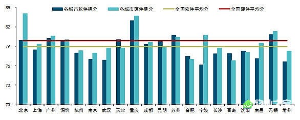 软件服务提升空间较大。根据调研结果来看,二十个城市的硬件平均得分为78.95,高出软件0.87个百分点,这是因为一方面现代小区建设过程中的相关配套设施更加完善,有效提升物业服务中的硬件水平,另一方面,硬件标准体系相较于软件来看更易标准化和管理。