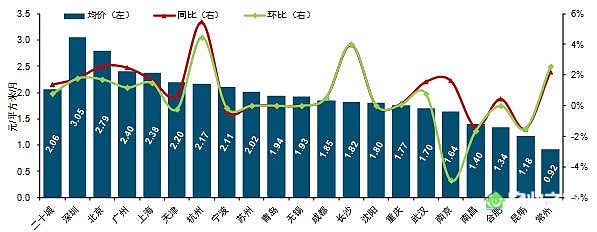 2014年12月,二十大城市物业服务均价为2.06元/平方米/月,较2014年6月上涨0.8%。其中深圳均价最高,为3.05元/平方米/月,北京、广州、上海紧随其后,分别为2.79元/平方米/月、2.40元/平方米/月和2.38元/平方米/月;天津、杭州、宁波、苏州的均价也在2元/平方米/月以上;青岛、无锡等12个城市的均价不到2元/平方米/月。可以看出,一线城市的经济水平最发达,物业服务均价也处于较高水平。
