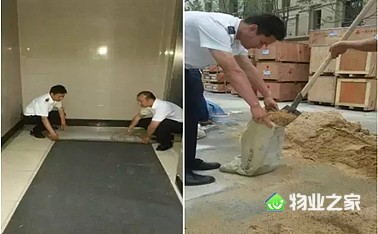 秩序维护员在电梯口铺上防滑垫,并准备好沙袋,随时最好防洪抗洪的准备