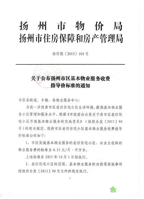 关于公布扬州市区基本物业服务收费指导价标准的通知