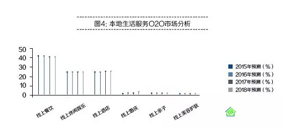 现在,物业管理市场提供社区线上线下O2O服务体验的优势已越来越明显,越来越多大型企业通过云端大数据等方面的优势重新组织线上线下服务市场,同时增加融通消费和金融层面的各种增值服务。根据艾瑞咨询数据,线上餐饮、娱乐成为O2O平台线上的最热门的项目,分别占到本地生活服务O2O市场的42%及25%左右(图4)。互联网社区的普及和使用让用户体验更加完善,同时还会使管理更加透明化、高效化、并且降低了成本。